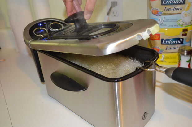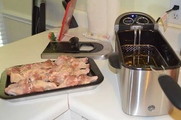 Poner las alas en la cesta, pero no de la capa les. Pude obtener 7 en la cesta. Freír a 375 grados durante 8 minutos. Asegúrese de que estén completamente hechas.