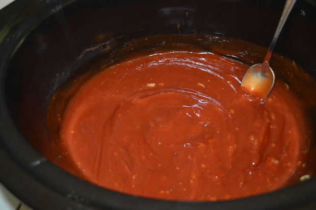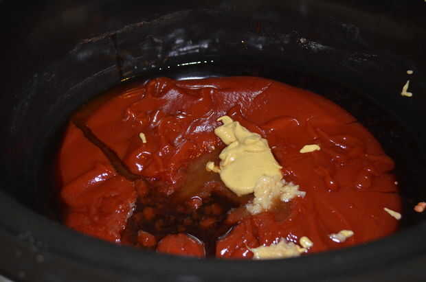 En la olla, combine la salsa de tomate, azúcar morena, vinagre, salsa Worcestershire, mostaza, ajo y 1/2 cucharadita de sal. Revuelva hasta mezclar bien.