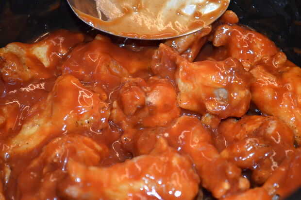 Ahora toma las alas y ponerlos en la salsa en la olla. Revolver que las alas tienen salsa sobre ellos. Puesto en bajo y cocine por 3.5-4 horas, revolviendo cada hora.
