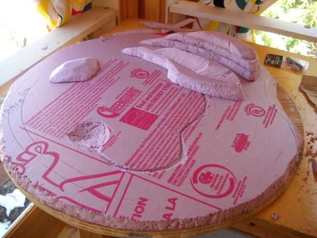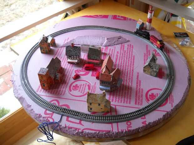 Diseño de las casas y en el río. He tallado capas de espuma para colinas de y calibrado el estanque y la corriente. Pegué la colina a la base, utilizando el pegamento blanco. No usar epoxi, se comen a través de la espuma. Lija en los bordes.