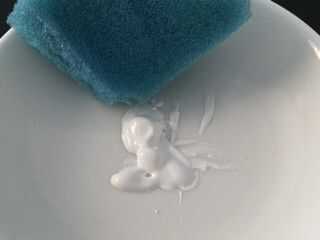 Firmemente sostenga el vaso con una mano y con la otra hacer manchas enérgicos de esta esponja todo el corazón.