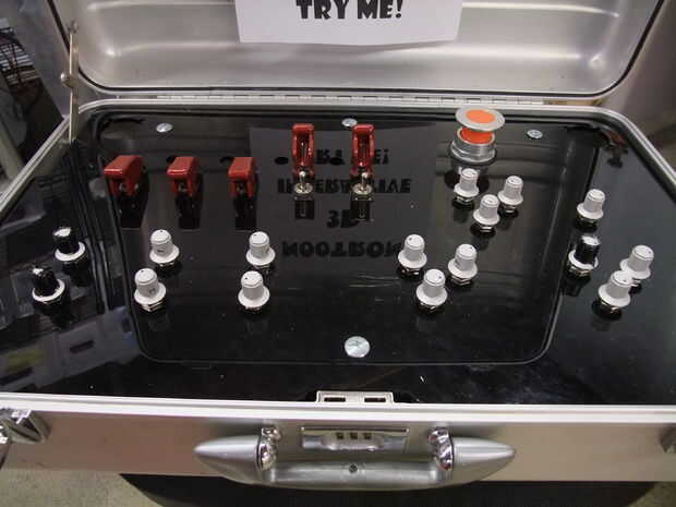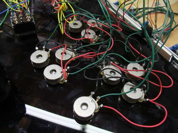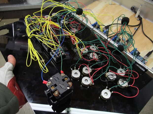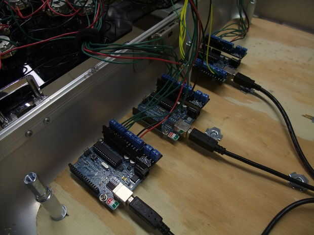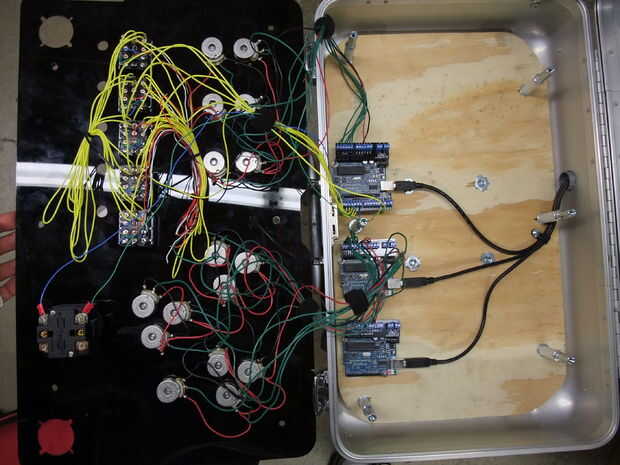El arduino 3 conecta por USB a un Macbook corriendo el proceso. Un sencillo script de procesamiento Lee los valores de la perilla y el interruptor y los envía a una radio de Zigbee en el puerto serie.