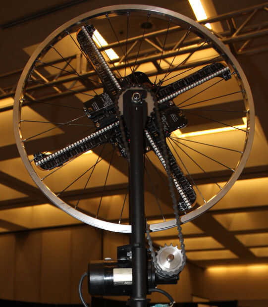 Montado dentro de la rueda es nuestro hardware de pantalla Video MonkeyLectric Pro . Estamos utilizando hardware estándar de Video Pro con el firmware personalizado para generar el arte. El hardware de pantalla tiene 256 LEDs a todo color dispuestos en 4 palos.