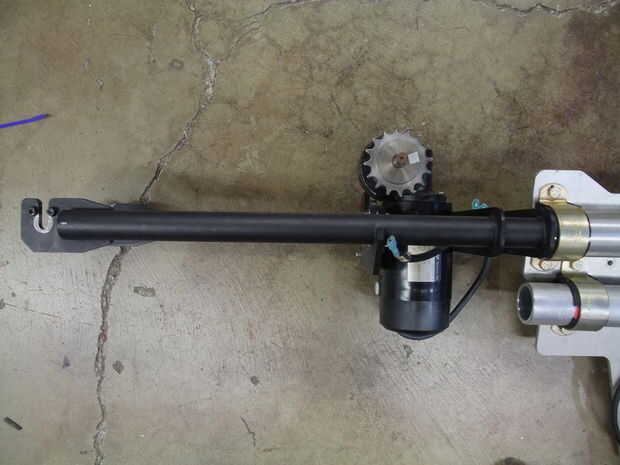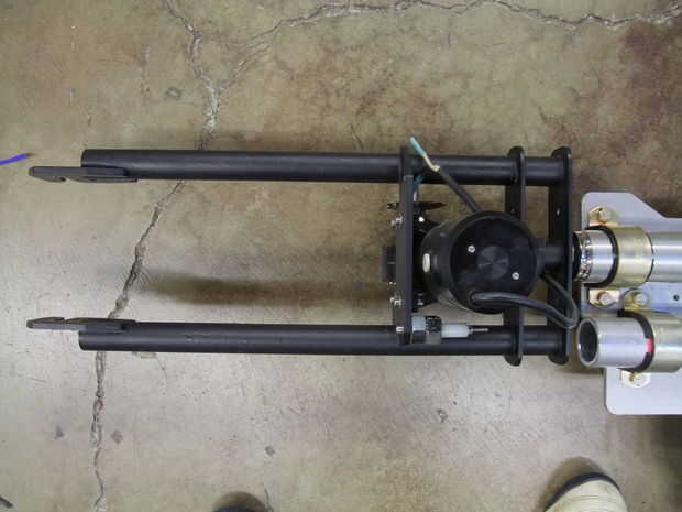 Hemos soldado un tenedor personalizado resistente para sostener la rueda. La horquilla es perfectamente recta (no rastrillo como una horquilla normal). Un montaje del motor es soldado con autógena en. Los tubos de la horquilla son cro-moly con 2mm de espesor de pared. Longitud a la horquilla total es aproximadamente de 400mm para los auriculares, además de un tubo de 350mm cabeza. La placa del motor y las placas de montaje de eje fueron cortadas con chorro de agua cnc de acero de 4,5 mm.