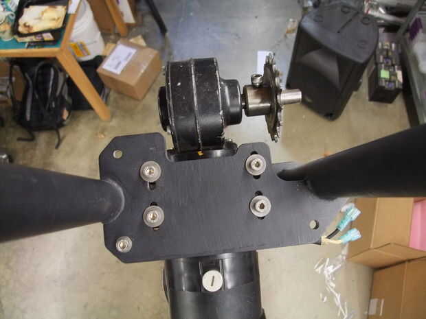 El 1 º motor de eje va montado sobre una placa en el centro de la horquilla. Las ranuras de montaje nos permiten cambiar el motor un poco para obtener la cadena tensada, así como equilibrar el peso de la horquilla.