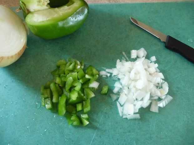 Cubra con la cebolla y el pimiento verde decorar... y chow abajo!