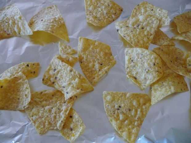 Precalentar el horno a 350 grados. Línea de una hoja de galleta con chips de Tortilla y cocer durante 3 minutos.