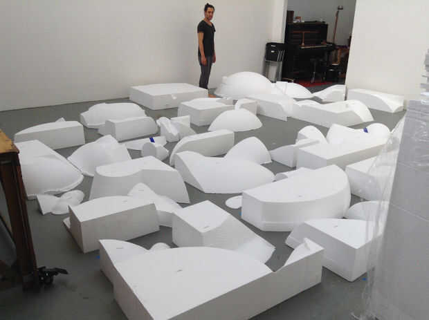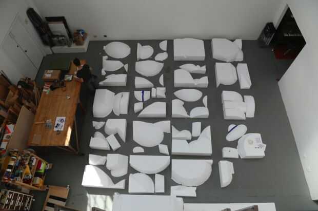 Colocación de piezas en el taller de preparación para el montaje. Coincide con una hoja de presentación con un esquema de nombres. Esto tuvo que coincidir con el diseño en Maya para asegurarse de que teníamos todas las piezas.