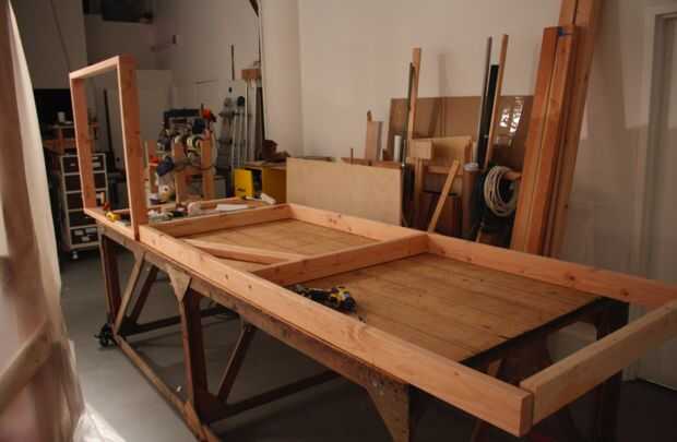 Se construye una pared temporal de 2 x 4 para montar la escultura en el estudio, emular cómo se cuelgan en el Museo
