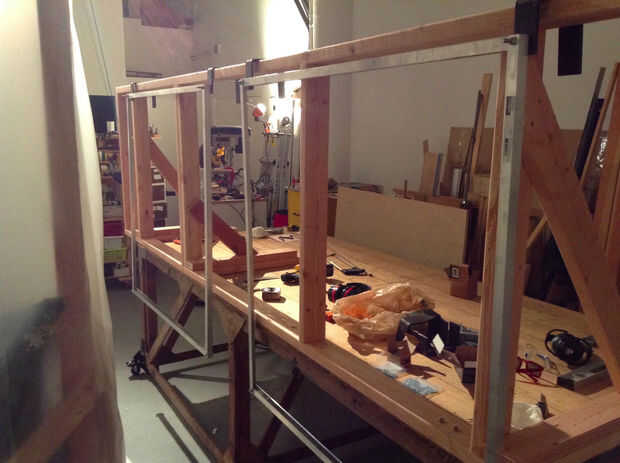 Se crean dos marcos de aluminio de aluminio tubular y ángulo recto que colgar en la pared temp. Los ganchos de acero grandes de se unen con pernos.