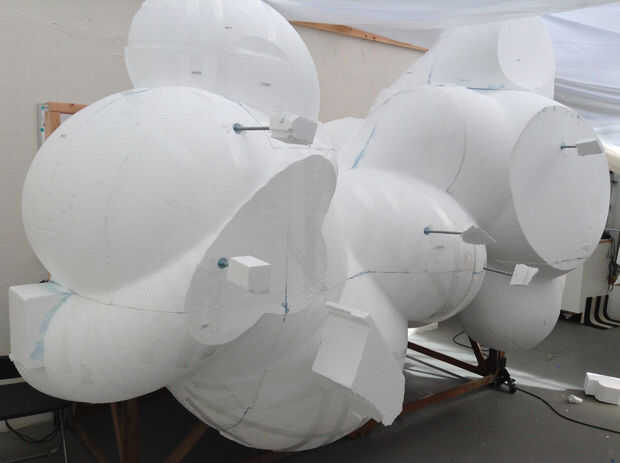 varillas de 1/2" roscado con tornillos y arandelas de fender de 2" se utilizan para mantener módulos de escultura a los marcos y adornadas con un rompecabezas o sierra para metales.