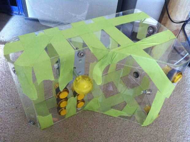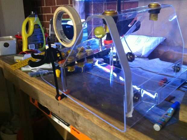 Los paneles laterales son hechos de plantillas por trazado alrededor del borde del cuerpo principal. Una vez cortadas, los paneles laterales se pegan luego en su lugar con disolvente acrílico set rápido que 'suelda' el acrílico juntos y forma un lazo muy fuerte.