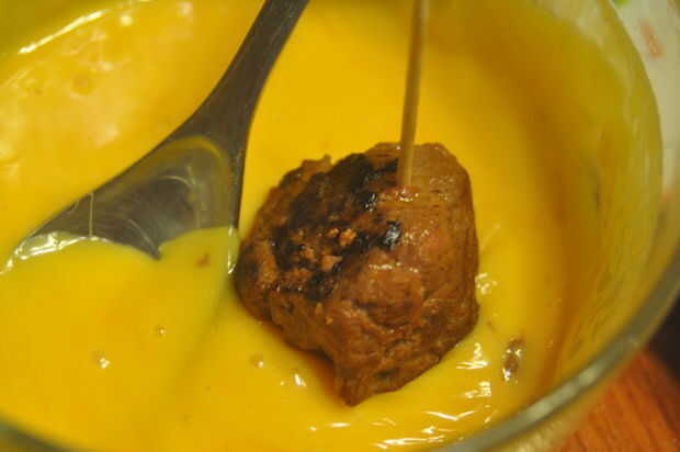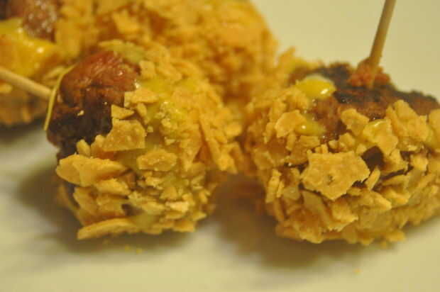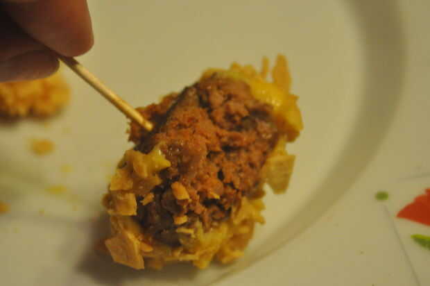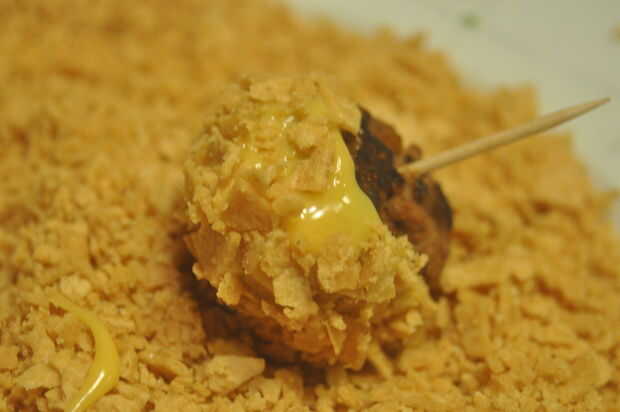 3.) una vez que la carne está casi listo queso cocina, poner algunas en un recipiente y de la microonda hasta que derrita. Entonces, rápidamente coge una selección de diente, pincho una bola de carne, inmersión en el queso fundido, rodar en las migajas del chip y luego ponerlo en un plato vacío o bandeja. Seguir haciendo esto (tienes que recalentar el queso de vez en cuando).