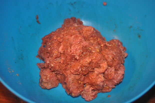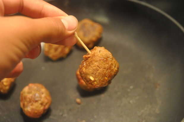 1.) preparar la carne. Combiné un paquete de carne de taco condimento a la carne molida para prepararla. Luego hacer bolitas con la carne y freírlas en una sartén hasta que estén color marrón oscuro en los lados. Asegúrese de les voltear de vez en cuando mientras se cocinan.