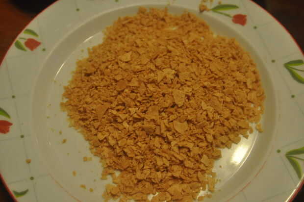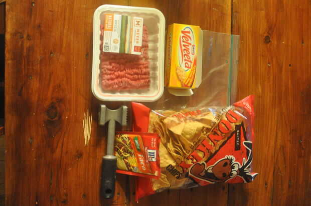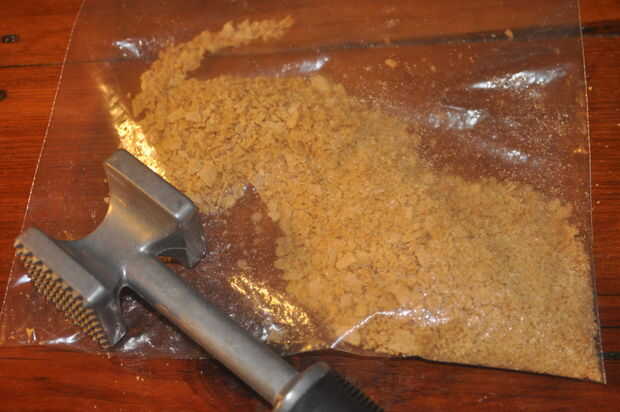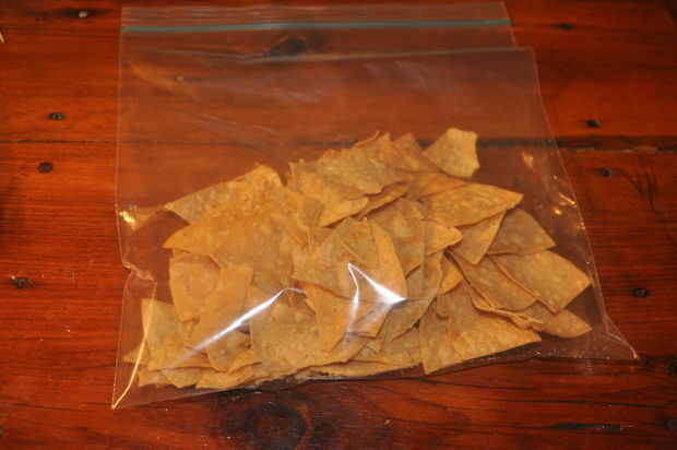 2.) como la carne se cocina, agarra un puñado de chips de tortilla y ponerlos en una bolsa zip-lock. Luego, toma una cuchilla de la carne y romper las virutas mucho así que hay sólo pequeñas migajas de izquierda. Vaciar las migas en un plato.