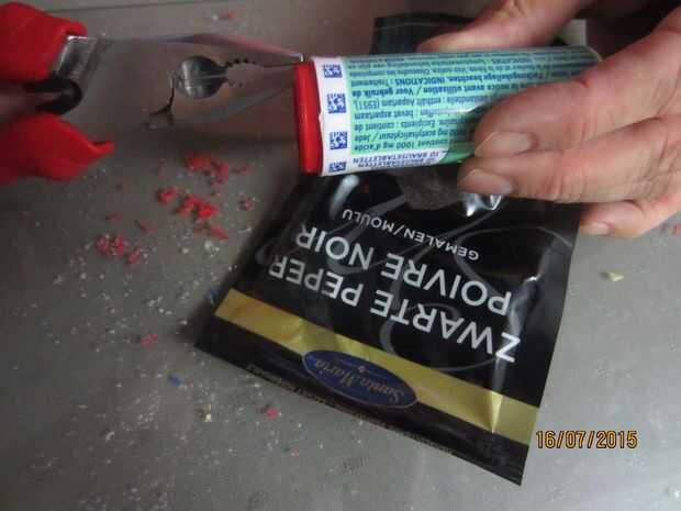 "Problema de diseño": para llenar el Pepperpot, es necesaria para sacar el tamiz rojo porque todas las piezas encajan sin ninguÌ n pegamento. Por ello se necesita una pinza para llenar el Pepperpot.