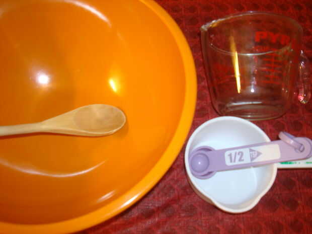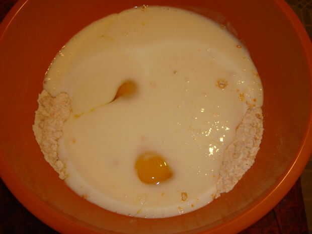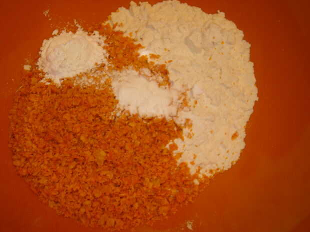 Mezclar los ingredientes secos, luego agregue el suero de leche y huevo (reservar 1 taza de harina para formar las bolas).
