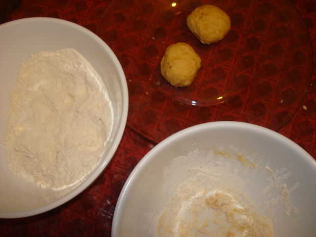 Vierta 1 taza de harina en un tazón pequeño y agregue lentamente la mezcla de pan de maíz hasta que tenga un bonito balón redondo. Sólo hice un par de estallidos debido a múltiples proyectos por lo que puede que tenga que añadir más harina. Después de que la mezcla no es pegajosa y se puede formar en bolas hacer bolas pequeñas.