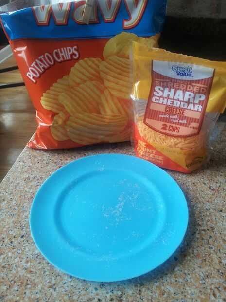 Vas a necesitar chips, queso rallado y una placa. Obviamente esto no es lo más saludable, así que comer con moderación