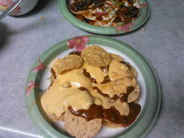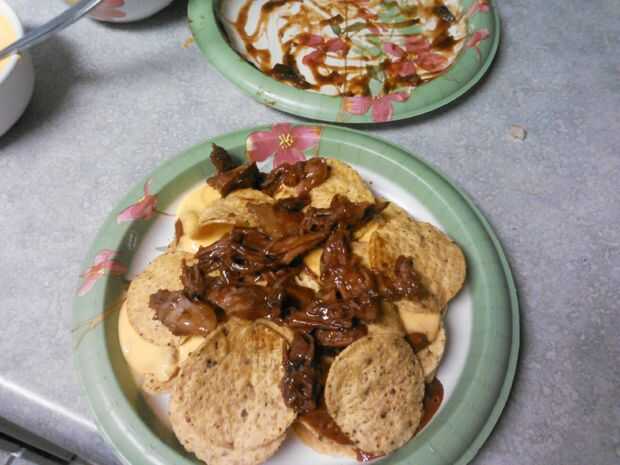 bien ahora es el momento para poner todo junto. la manera de hacerlo es poniendo abajo mi capa de virutas seguido por una buena capa uniforme de barbacoa carne luego agregar una capa de chiles y luego una capa de queso... repiten estos pasos hasta que usted tiene la cantidad deseada del cielo de nacho