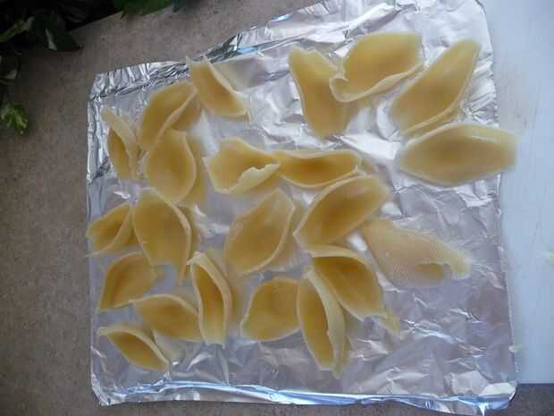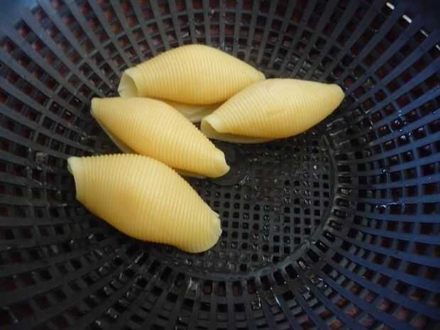 Hervir las conchas de pasta 5 minutos ya que indican las instrucciones. (pasta al dente no buen gusto frito) Para que la pasta no se pegue, asegúrese de añadir sal al agua de cocción y mantener el agua en plena ebullición durante el tiempo de cocción.