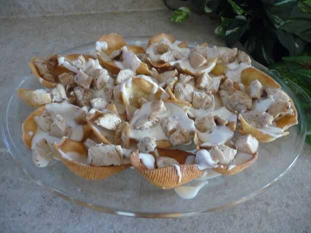 Usando una espátula, traspaso las tuberías calientes pollo Alfredo Nachos en una fuente de servir... y disfrutar!