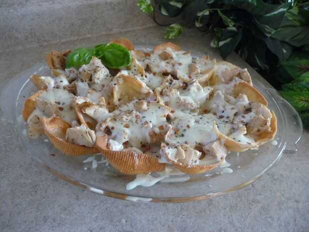 - Esparcir uniformemente los trozos de pollo sobre las fichas de pasta salsas.