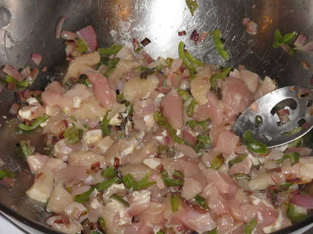 Gire el calor a medio-alto, para mantener la temperatura incluso y cocine hasta que el pollo es de color blanco a través de.