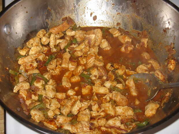 Permiten la mezcla a cocinar mientras que abajo, revolviendo, hasta que el líquido se absorbe en su mayoría, y empezando a parecerse a un almíbar delgado. Esto concentra el sabor y permite el pollo absorber algunas de las especias. Cantar mientras revuelve - (opcional)