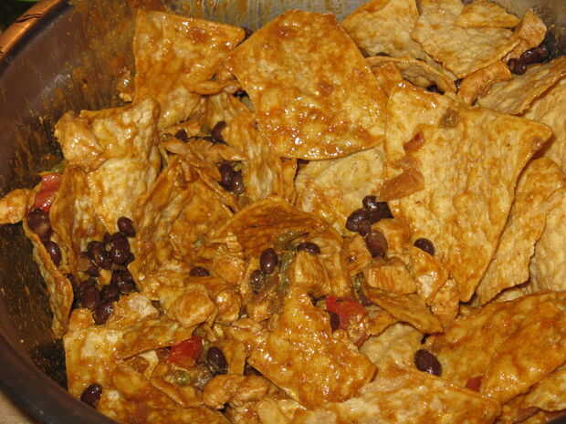 Mezcle la mezcla con cucharas grandes, sus manos, o por lanzar el tazón de fuente para que el contenido flip-revolver, hasta que estén uniformemente cubiertas.