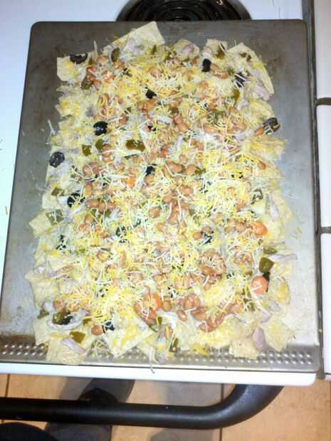 Ahora es el momento de colocar estratégicamente todos los ingredientes, excepto el guacamole, cebollino, salsa verde de salsa verde y crema agria, en un horno grande de la hoja o pan. Usted quiere asegurarse de que cada bocado solo es tan buena como la siguiente. Sólo no tirar todo en allí, desea difundir todos los ingredientes uniformemente, hasta el borde de las fichas. Una vez que sus nachos mira listos, colocarlos en un horno precalentado a 350 grados durante unos 5-6 minutos. Tiempo justo para derretir el queso.