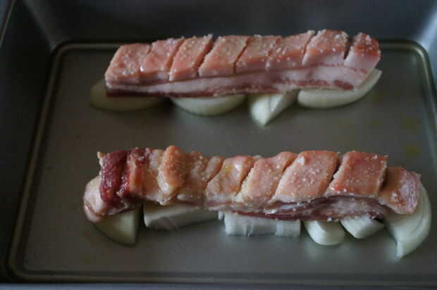 Cortar la panceta de cerdo por la mitad. (Mi pieza era muy largo y no cabe en la bandeja).  Cortar una cebolla en rodajas gruesas y colocar en sartén. Vierta 2 tazas de vino en la sartén. Coloque la panceta de cerdo en el horno por la mitad y a hora en 465 grados F.