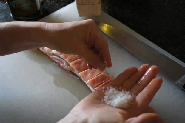 Pone la panceta de cerdo piel hacia en la superficie de trabajo limpia. Marcar suavemente con un cuchillo afilado. La piel dura, así que asegúrese de que la navaja está afilada o no pasar. No penetran en la carne, profundamente bastante para romperse a través de la piel. Aplique una capa delgada de aceite de oliva de buena calidad sobre la piel. Luego generosamente espolvorea una buena cantidad de sal sobre la piel y luego frote.