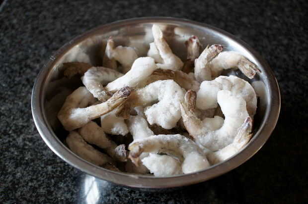 Para preparar los camarones, colocar en un recipiente para descongelar. También puede utilizar camarones frescos. Una vez que se descongela los camarones, quitar las colas y Desvene los camarones si se prefiere. Añadir unas cucharadas de aceite de canola y espolvorear generosamente con sal. Espolvorea unos copos de pimiento rojo picado en la parte superior y revolver muy suavemente para combinar. Abrigo con el abrigo de saran y colocar en la nevera durante al menos 30 minutos.