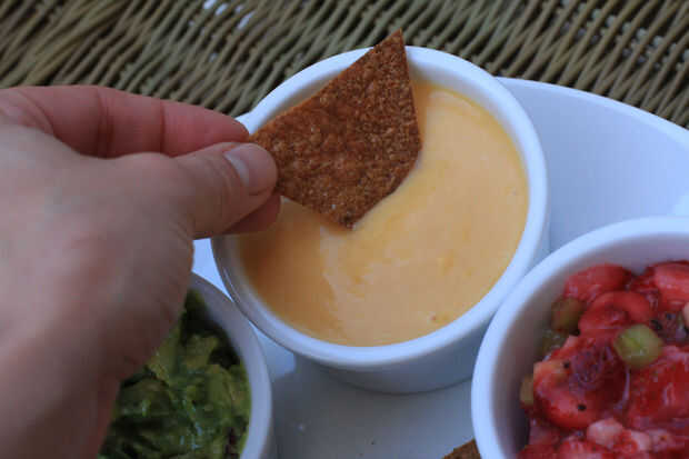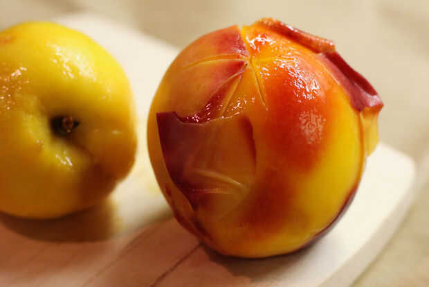Retire la piel de los melocotones. ¿Suena como un dolor? Lo hice por blanqueo, que significa agregar una raja pequeña en la piel, hervir por unos minutos y que impactante en agua con hielo. La piel viene justo al lado. (Aquí hay un video de demostración de blanqueo). Luego cortar el melocotón en trozos y echarlo en la licuadora hasta que es puré de correctamente. Añadir yogur griego a la licuadora en pequeñas cantidades hasta obtener un bonito nacho queso color y textura. Si tus melocotones son dulces y le gusta el sabor ácido del yogur, se puede detener aquí. De lo contrario, agregue y mezcle en algunos miel al gusto.