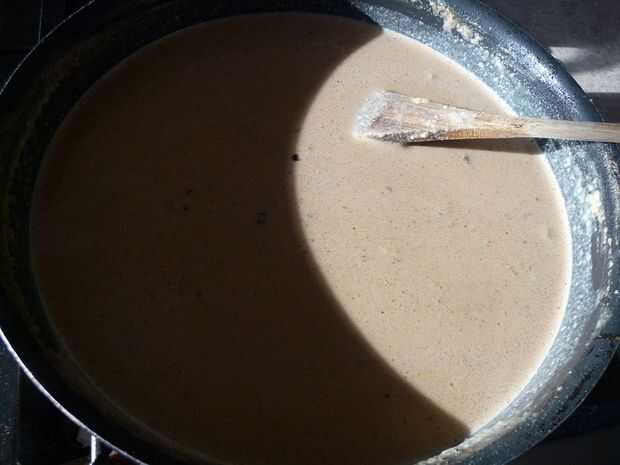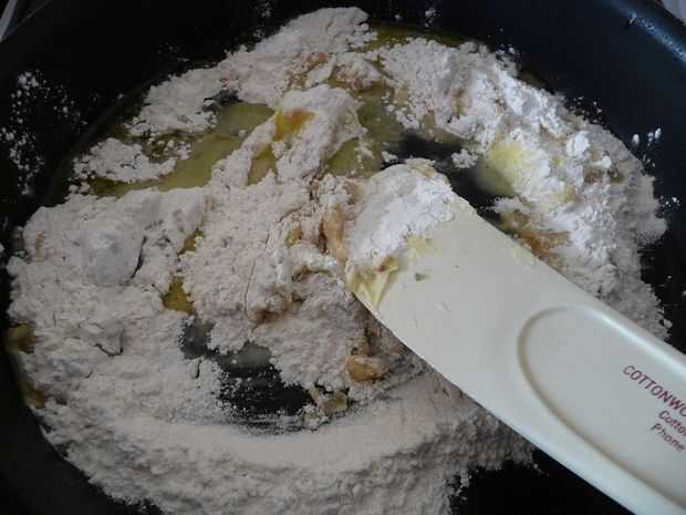 Poner la grasa de mantequilla en una sartén grande, a continuación, añadir la harina...
