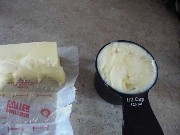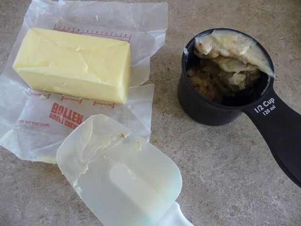 Raspe el caliente goteando en una taza de medir, luego agregar suficiente mantequilla para medir 1/2 taza.