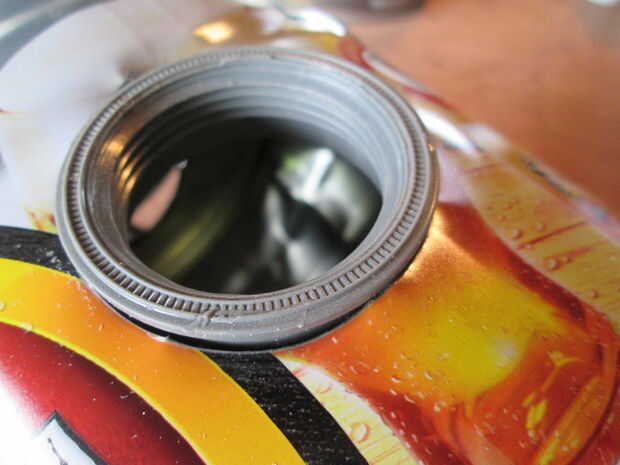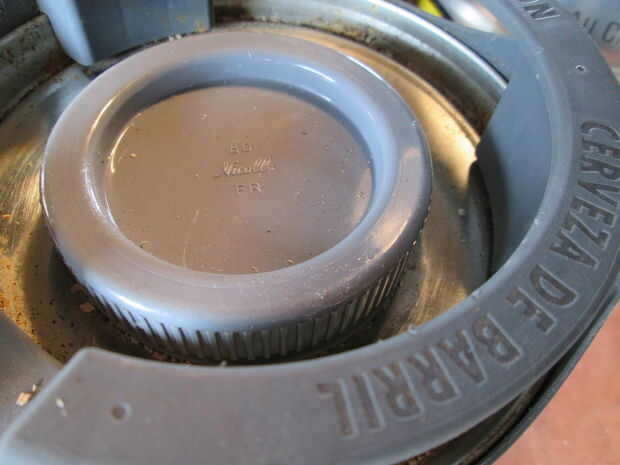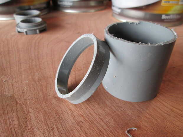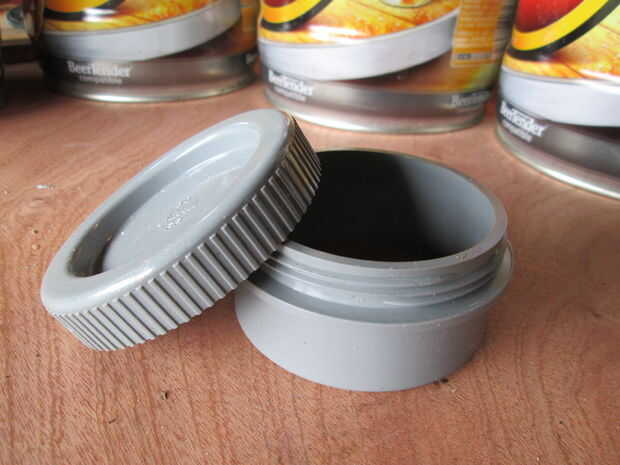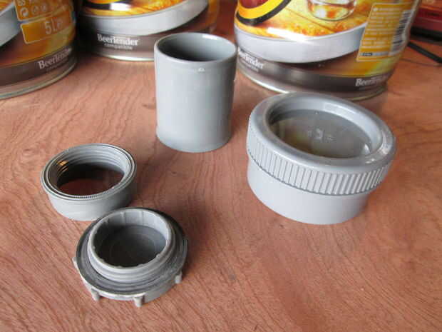 Tomar la tapa de la entrada, cortar un anillo de una conexión, inserte la cubierta en el barril y el anillo desde el interior a la parte trasera de la tapa para sellar ese anillo agradable en lugar del pegamento.