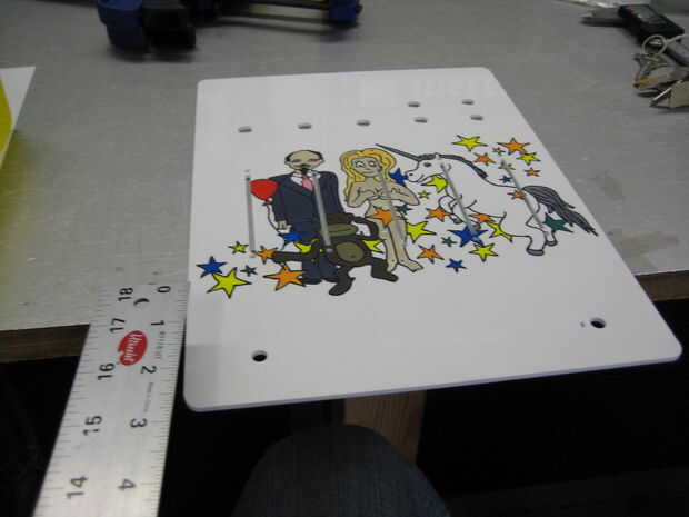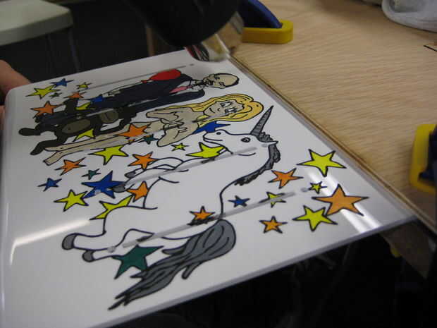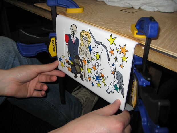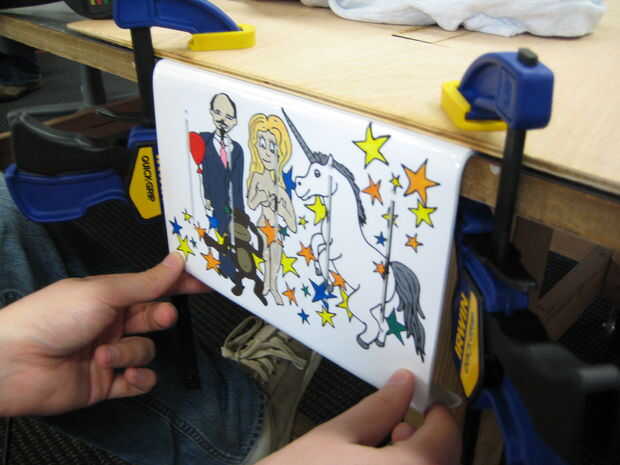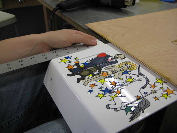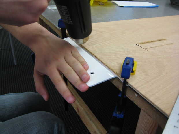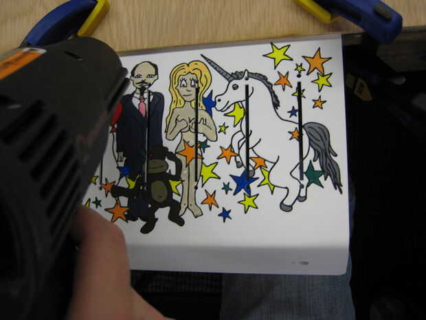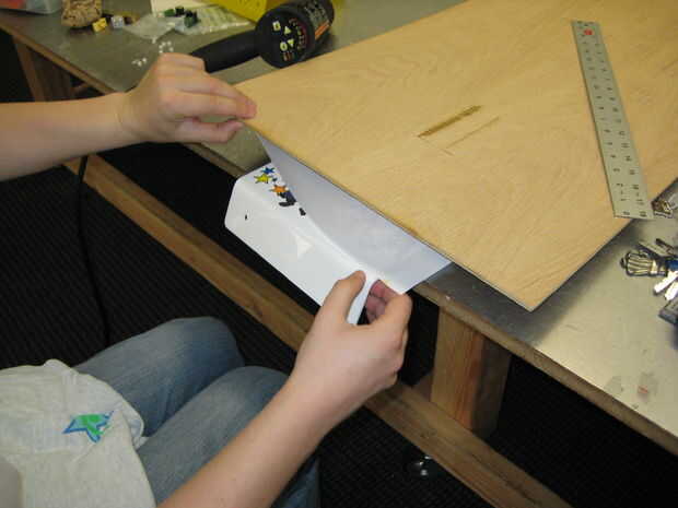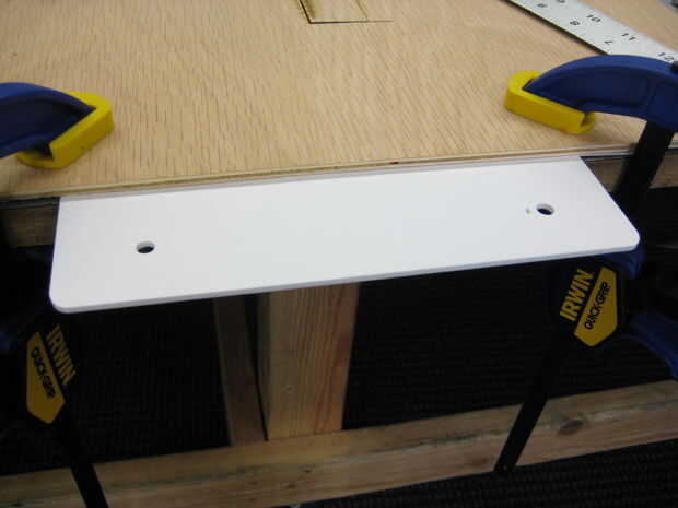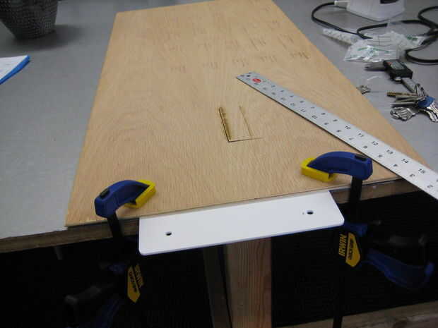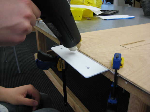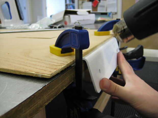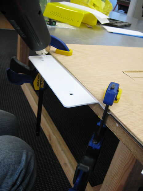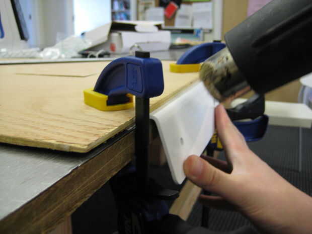 Ponga su acrílico plano sobre el aluminio o tablero a prueba de calor. Medida para que el acrílico está pegando 2 1/4" sobre el borde de la mesa y los dos agujeros para el potenciómetro y auriculares jack están cerca de usted. Coloque una hoja de papel sobre la pintura (para protegerlo), pero asegúrese de que sea fuera del camino de la pistola (que será calentar la articulación donde el acrílico se encuentra con el borde de la mesa). Coloque la madera encima del acrílico y sujete en su lugar. Calentar el acrílico a lo largo de la Unión donde se sujeta y una vez que lo veas empieza a decaer un poco, tratar de flexión hacia adelante. Si es flexible, curva a aproximadamente 80 grados y mantener en su lugar hasta que comience a llevar a cabo su propia forma.