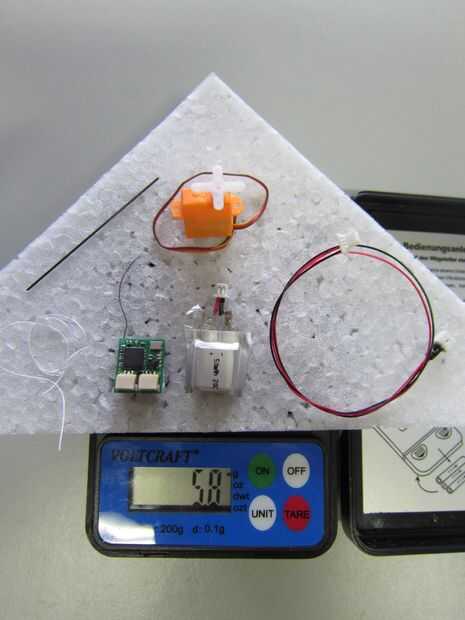 - Un ultra micro servo bajo 2g (un tipo regular, no uno lineal). Usé un llamado servo 1,7 g, que en realidad pesa 1,9 g con cables y el conector. Asegúrese de que el conector es compatible con el receptor. Esto servo va 12 EUR a USD 4, dependiendo del proveedor).
