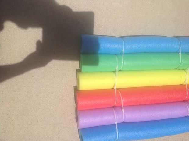 he decidido realizar una balsa de fideos nadar.  Elegí 6 variados color 3-1/2 "X 4-1/2' nadar fideos vendidos en diferentes tiendas.  Se pueden utilizar más si lo desea.  Até 2 fideos junto con ataduras de cremallera de nylon espaciamiento 4 lazos a lo largo de la longitud de los fideos.  Tuve 12" zip lazos en mano por lo que necesitaba para conectar 2 lazos para conseguir la longitud que necesitaba. Se puede utilizar solo 2' amarra en cada lugar.  Después libremente limito el par de fideos juntos, el revés los lazos zip, les aprieta y les cortó flush con cortaúñas o cortadores de alambre para que algún borde afilado se hacia de los tallarines.  Encontré con tijeras de uñas que pude cortar los extremos de los lazos zip no existieron bordes afilados.  Hacer 3 pares de fideos, luego los pares juntos para completar la balsa del gancho.