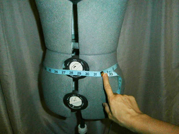 Medido algunas pulgadas hacia abajo de la cintura natural para complementar mi traje (medida A) medida por cuánto tiempo desea que la cintura de la gota para ser. Para mi proporciones 6"(medida B) era perfecto. Mida alrededor de sus caderas en este punto más bajo (medida C) medir cuánto tiempo desea que la sección de falda de círculo a. (Medición de D) Mi vestido era 6"