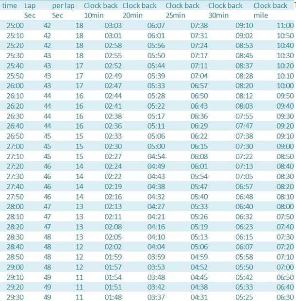 Es necesario recordar 3 cosas: empezar a tiempo (puede ir por un tiempo antes de comprobar y saber cuando termine), su meta paso a-5 segundos por vuelta, y mantener la pista cada vez que el barrido (segunda) mano pasa 60/0 contar minutos. Dado sólo varía una o dos segundos por vuelta (al menos deberías si tratas de mantener el ritmo, empiezo fuerte pero por la tercera vuelta mi ritmo no varía mucho) el tiempo total no es un problema.