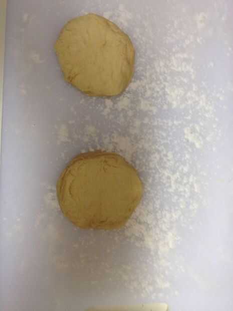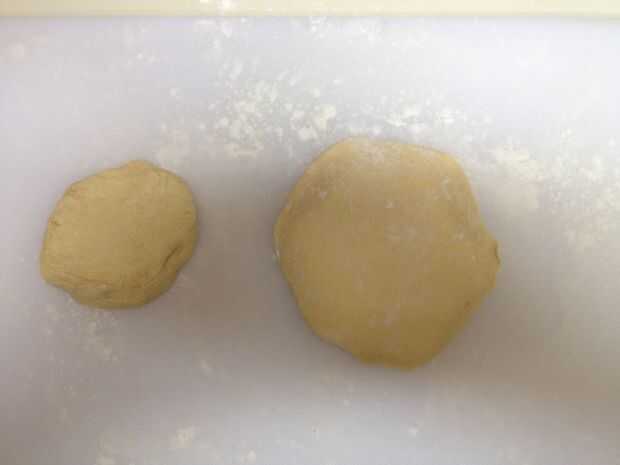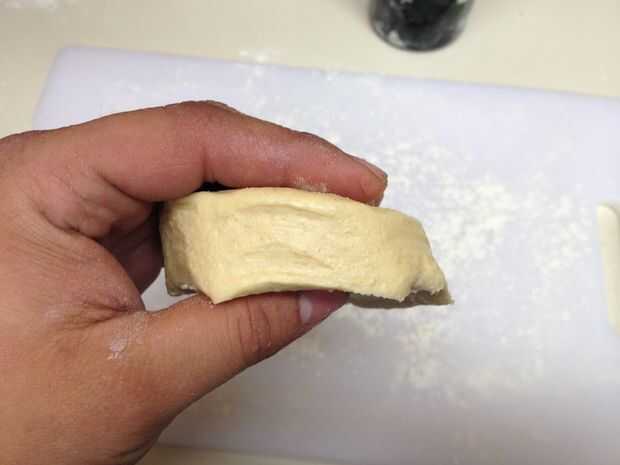 La superficie de preparación de la harina para que tus galletas no se peguen. Abre el grands Pillsbury y una galleta. Dividir el bizcocho por la mitad. Tome una mitad y en posición plana. Rodillo o estirar la galleta fina hasta dos veces el normal.