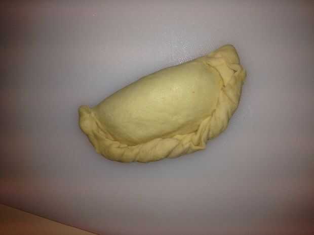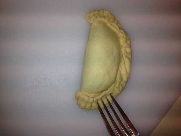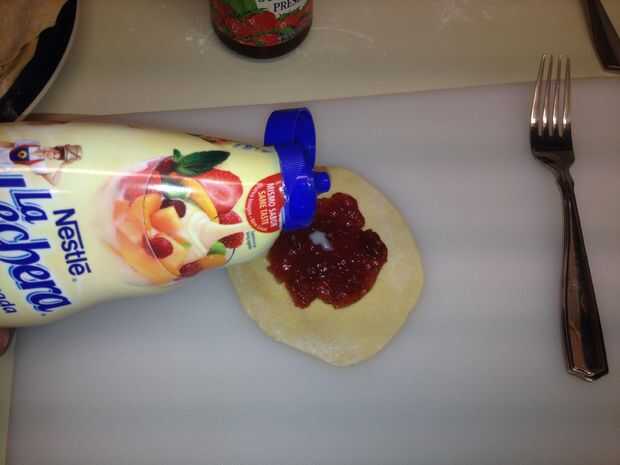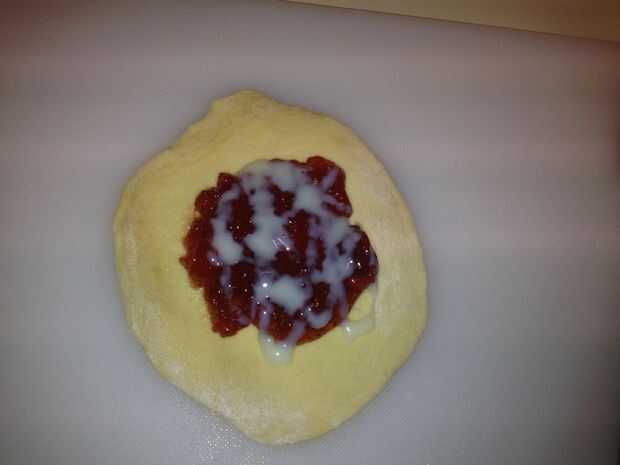 Abra la reserva fresa y poner una cucharada en la galleta aplastada. Añadir alguna crema. Doblar la galleta por la mitad formando un bolsillo. Doble o los bordes del rodillo hasta que se cierra el bolsillo. Tomar un tenedor y doblar el borde para evitar que el bolsillo se abra durante el proceso de cocción.