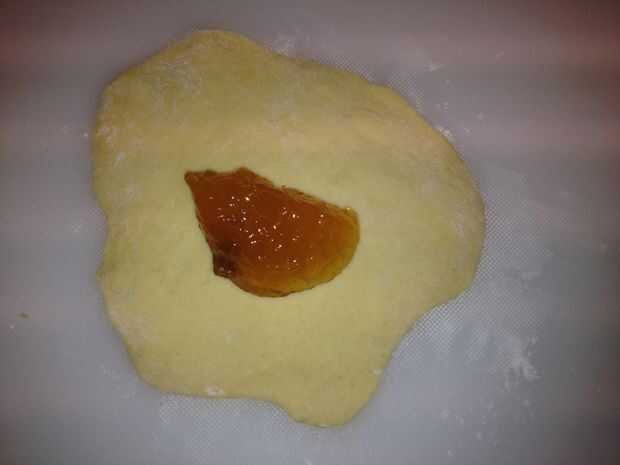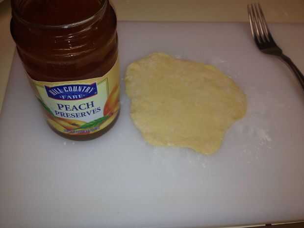 Abrir la conserva de durazno y colocar una cucharada sobre la galleta aplastada. Doblar la galleta por la mitad formando un bolsillo. Doble o los bordes del rodillo hasta que se cierra el bolsillo. Tomar un tenedor y doblar el borde para evitar que el bolsillo se abra durante el proceso de cocción.