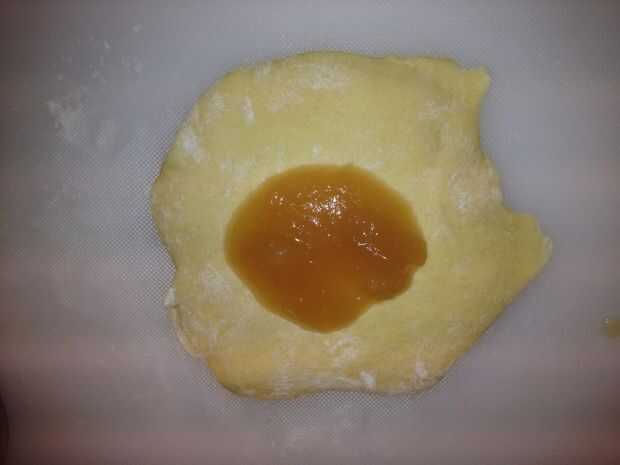 Puede utilizar manzanas guisadas o fritas. Para ahorrar tiempo he comprado una lata. Si las manzanas son en grandes latas de picar o puré de ellos. Colocar una cucharada de manzana relleno sobre la galleta aplastada. Doblar la galleta por la mitad formando un bolsillo. Doble o los bordes del rodillo hasta que se cierra el bolsillo. Tomar un tenedor y doblar el borde para evitar que el bolsillo se abra durante el proceso de cocción.
