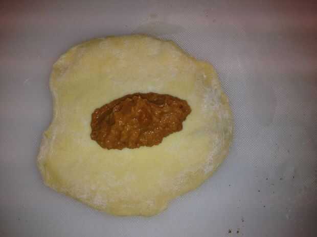 Coloque una cucharada de relleno sobre la galleta aplastada de calabaza. Doblar la galleta por la mitad formando un bolsillo. Doble o los bordes del rodillo hasta que se cierra el bolsillo. Tomar un tenedor y doblar el borde para evitar que el bolsillo se abra durante el proceso de cocción.
