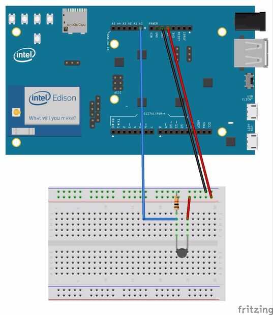 -Tome un termistor y un resistor de 10K y conectarlo a un pin analógico usando un circuito divisor de tensión.