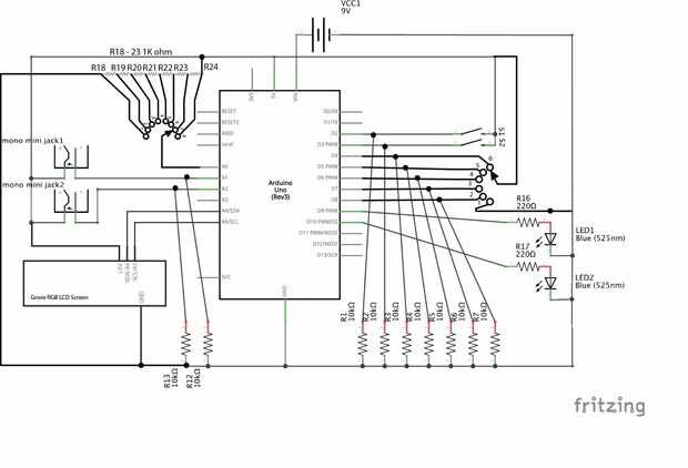 Descargar e imprimir el esquema adjunto para referencia fácil. Recomiendo usar el escudo de proto de Adafruit para construir el circuito, de esta manera que el circuito puede extraerse el breakout Junta en cualquier momento.